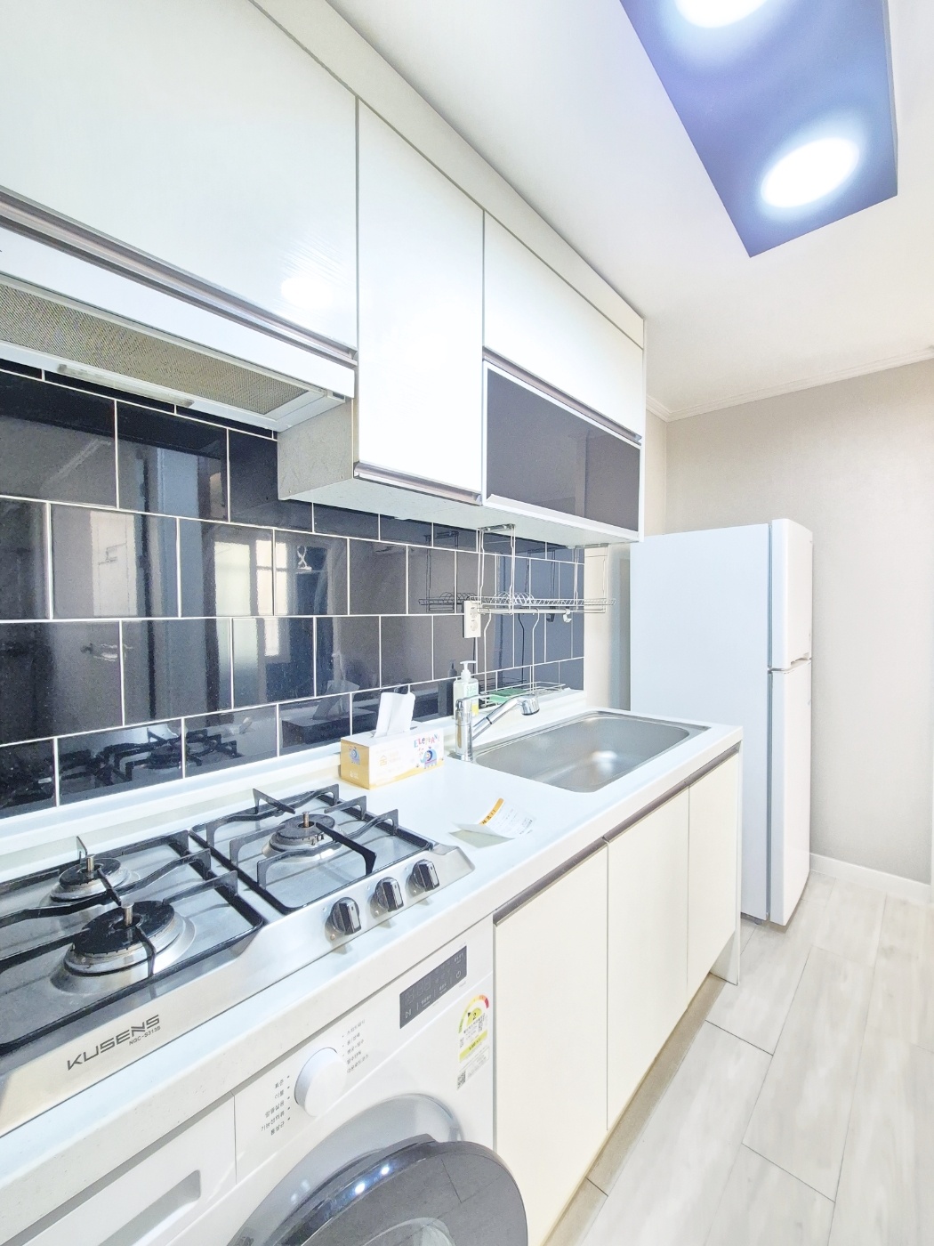 v  주방 가스렌지 3구이며 드럼세탁기 매립되어있어요